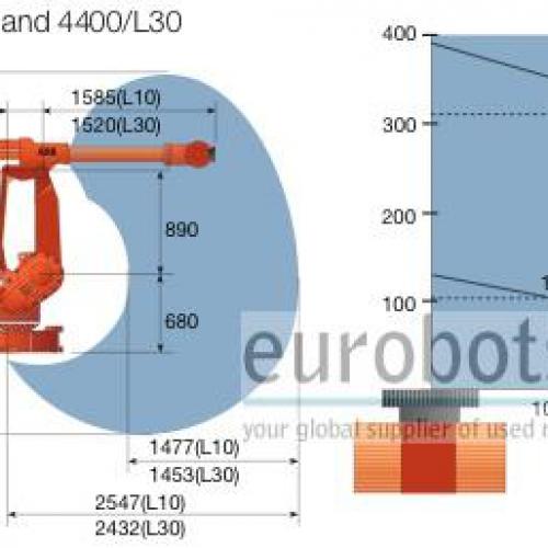 Long arm version of the IRB4400 with 2432 mm horizontal arm reach. An extremely fast, compact robot for medium to heavy handling. Exceptional all-round capabilities make it suitable for a variety of manufacturing applications.