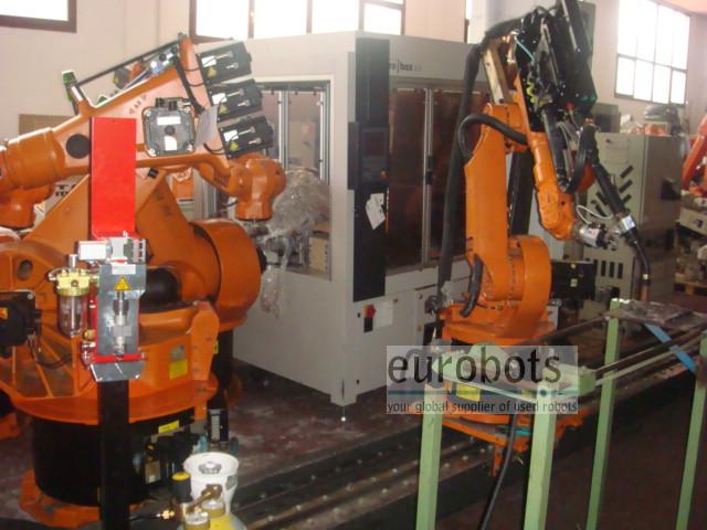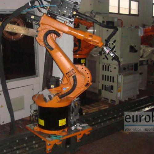 Robot 6 ejes modelo KR6/2 montado sobre un carril de desplazamiento lineal servocontrolado de 5 metros de longitud modelo KL250, 4 metros de carrera útil.